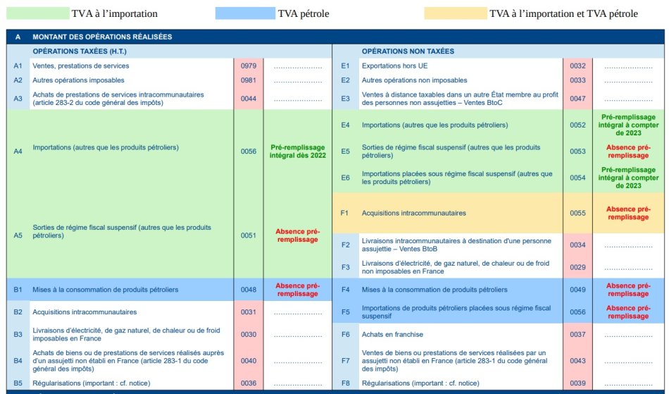 De nouvelles cases apparaissent relatives à la mise à la consommation de produits pétroliers et surtout d’autres cases liées aux importations et préremplies.