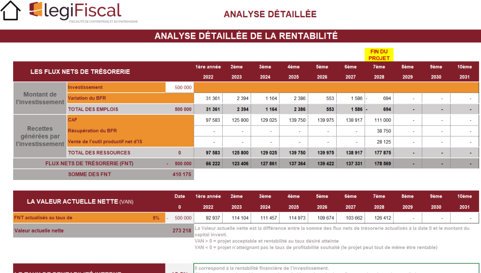 - Déterminer si votre investissement est rentable, en calculant par exemple le résultat net d'exploitation net d'IS, la valeur actuelle nette de l'investissement, ou encore son taux de rentabilité interne,